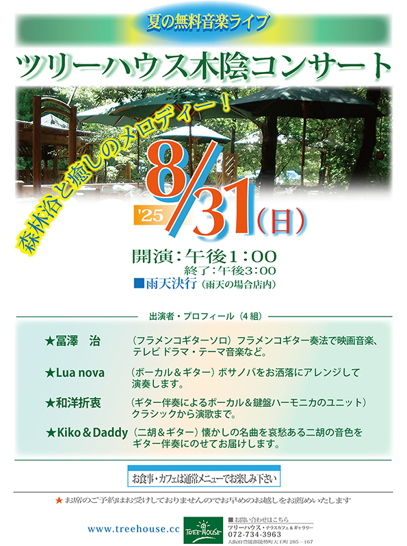 〜26周年記念・夏の涼みと癒しの森林浴〜 生ライブ・イベント♪ ●森のカフェの涼夏・深緑コンサート ◇ログカフェにて森林浴で癒されながら楽しむメロディー◇ ★どなたでもご自由にお好きな時間にご来店いただけます。 森のログハウス•カフェで、すてきな音色と、ツリーハウス特製 大人気「終日ランチ」やドリンク、スイーツの通常メニューで、 Tree Houseならではの和みのひとときを ごゆっくりお楽しみいただけます♪ 🎵〜心あたたまる音色に包まれて 緑と木のやさしさいっぱいの癒しの空間でリセット〜🎶 冨澤治: フラメンコギターソロ Lua nova: ボーカル&ギター 和洋折衷: ギター伴奏によるボーカル&鍵盤ハーモニカのユニット Kiko&Daddy: 二胡&ギターのデュオ |