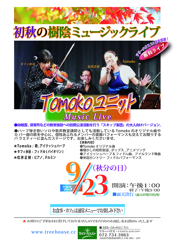 〜26周年記念・秋の涼みと癒しの森林浴〜 生ライブ・イベント♪ ●森のカフェにて涼みと癒しの初秋コンサート ◇ログカフェ森林浴ランチで楽しむ癒しのメロディー◇ ★どなたでもご自由にお好きな時間にご来店いただけます。 森のログハウス•カフェで、すてきな音色と、ツリーハウス特製 大人気「終日ランチ」やドリンク、スイーツの通常メニューで、 Tree Houseならではの和みのひとときを ごゆっくりお楽しみいただけます♪ 🎵〜爽やかな音色に包まれて 緑と木のやさしさいっぱいの癒しの空間でリセット〜🎶 Tomoko Unit (スキップ楽団) タフィ水谷: フィドル Tomoko: ボーカル、ハープ 松井正樹: ピアノ |