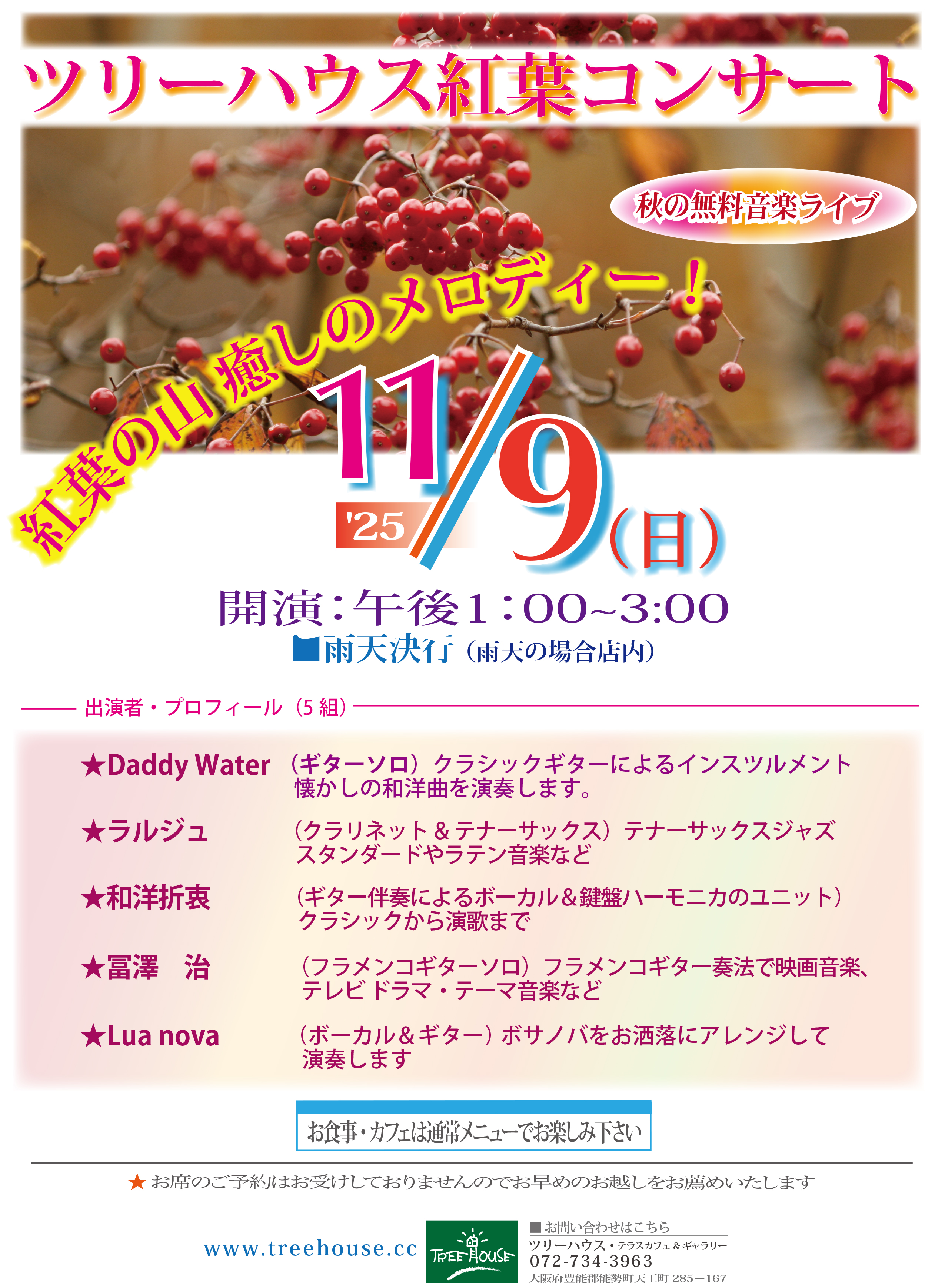 | 26周年記念 ライブ・イベント 参加費無料🎵 ◆2025年 11月9日(日) 出入り自由 予約不要 雨天決行 ◆ご案内ポスターはこちら ⚫︎寒暖調節できる上着 や 日よけ帽子 のご持参を お薦めいたします。 |